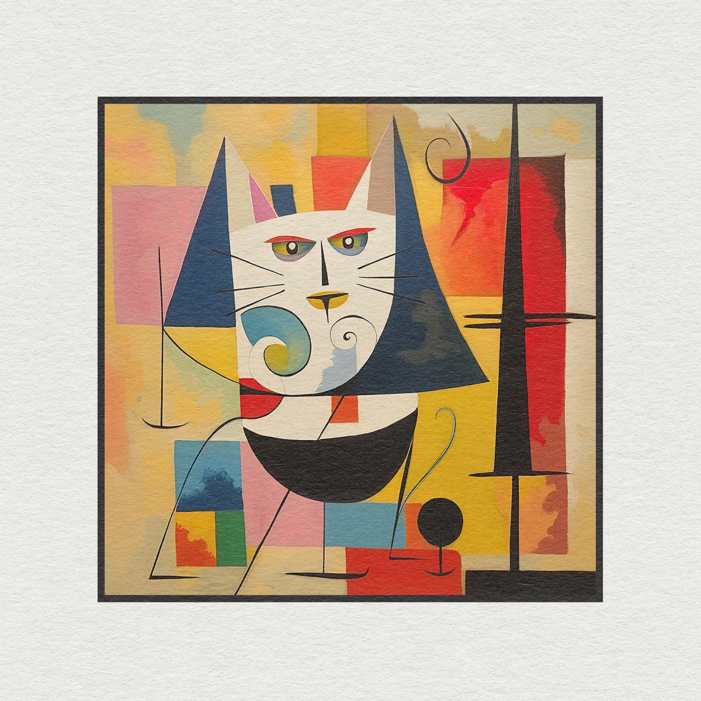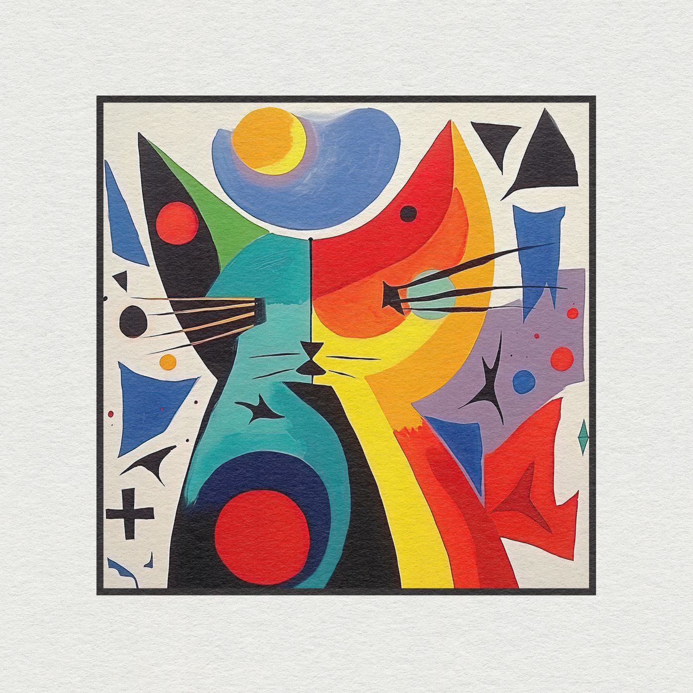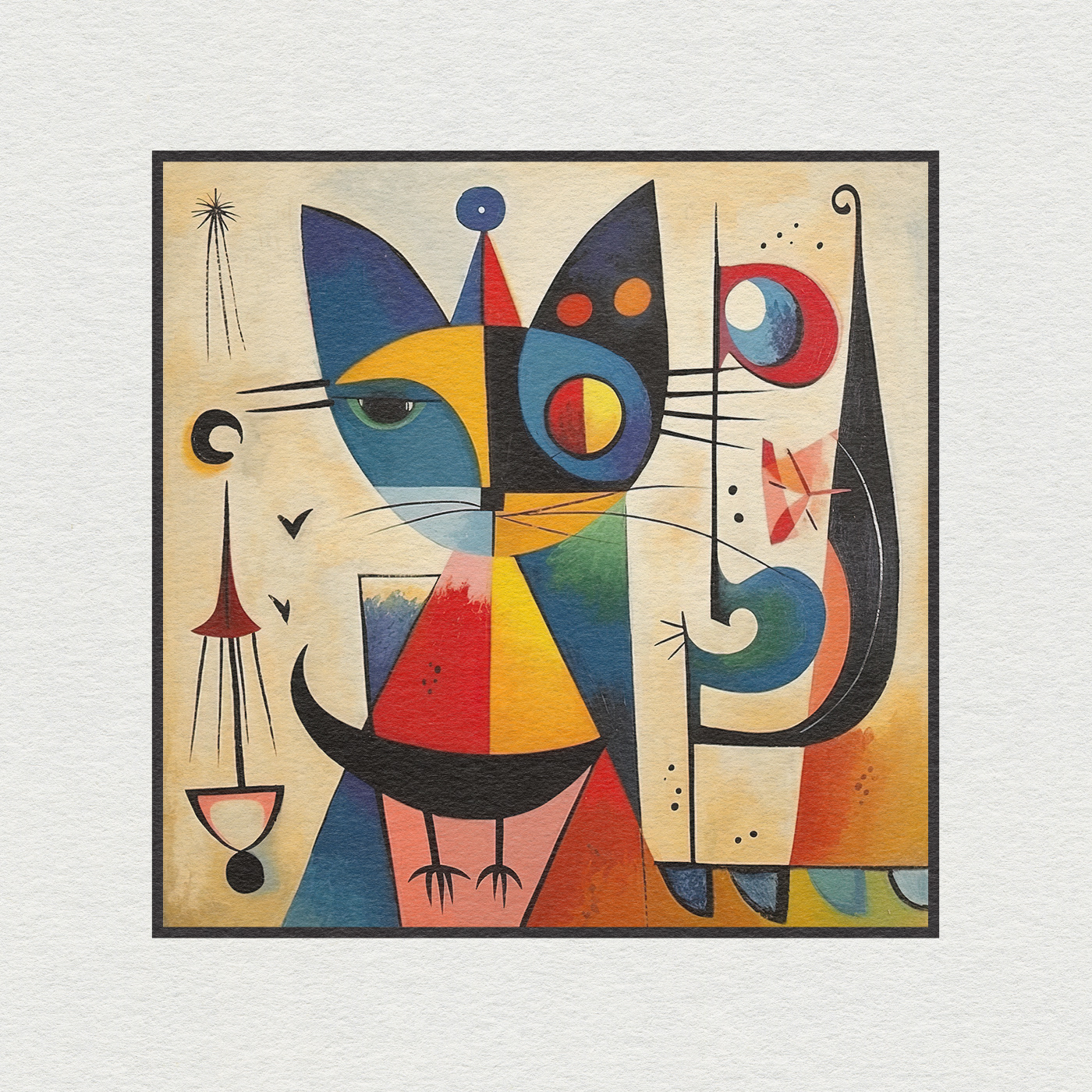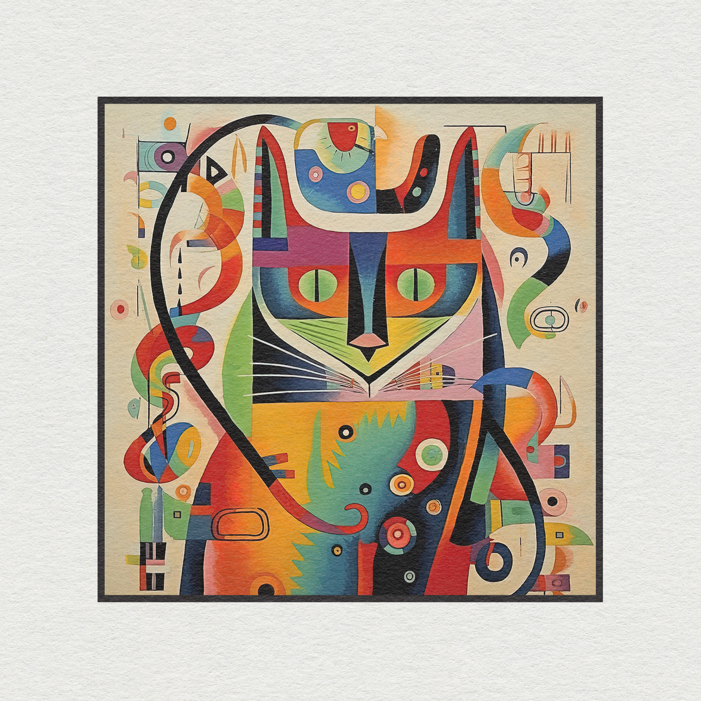"Feline Harmony: Cat Art Series inspired by the master of abstract art, Wassily Kandinsky. The cat's lithe form is skillfully composed of geometric shapes, reminiscent of Kandinsky's groundbreaking use of lines and angles. Vivid colors explode from the canvas as if the very essence of the feline spirit has been translated into an explosive symphony of hues.